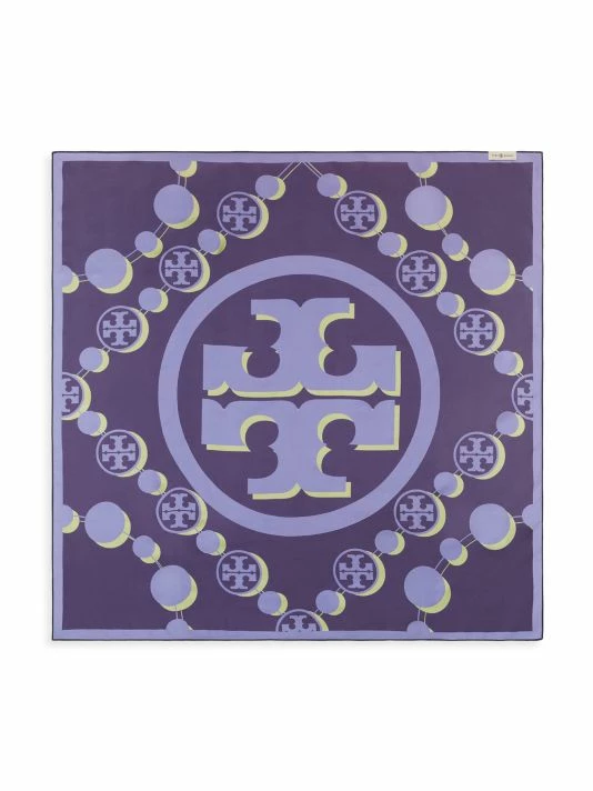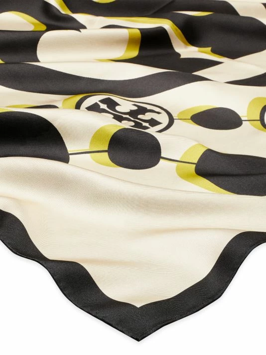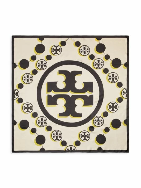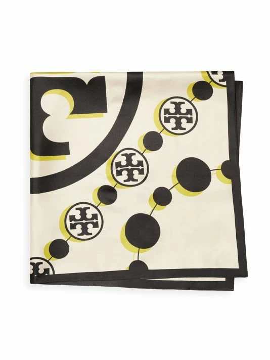 Tory Burch’s monogram scarf is an artistic and graphic interpretation crafted of silk twill. The contrasting colors create an optical 3D effect.