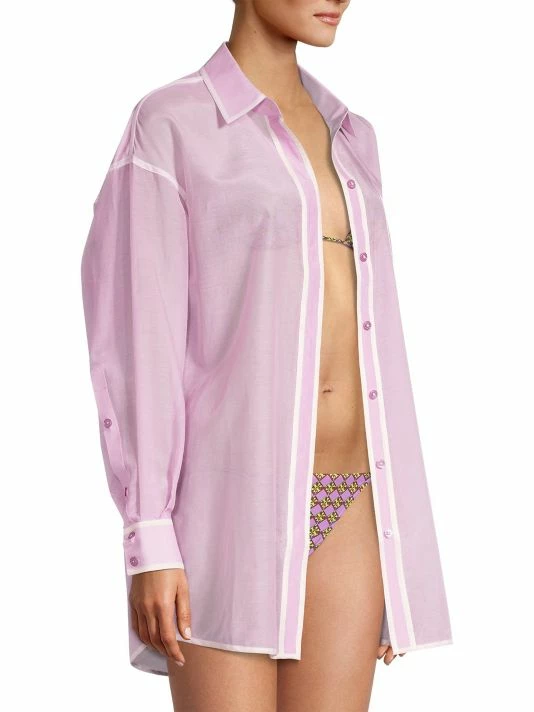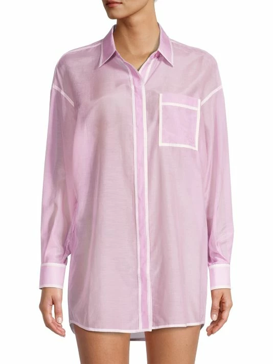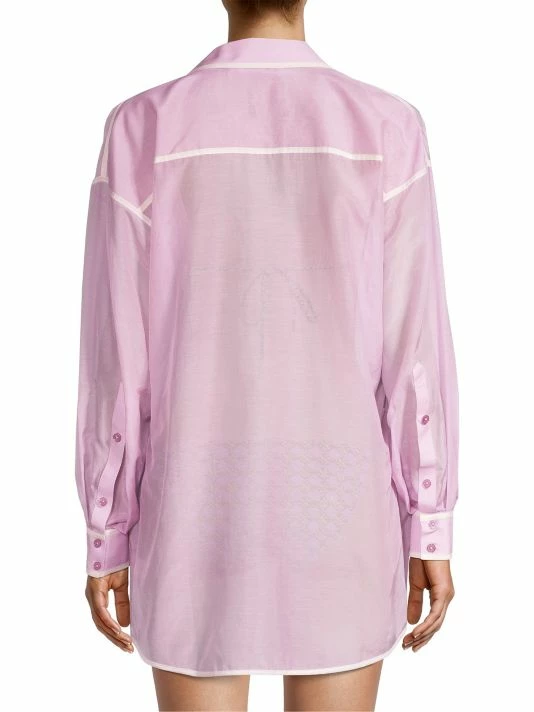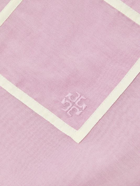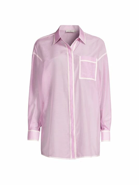 The Beach Shirt by Tory Burch features contrast taping at the collar, placket, armhole, cuffs, and left chest pocket. A signature logo motif is embroidered on the chest pocket. It is finished with mother-of-pearl buttons.