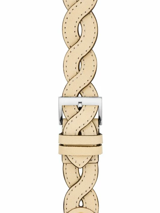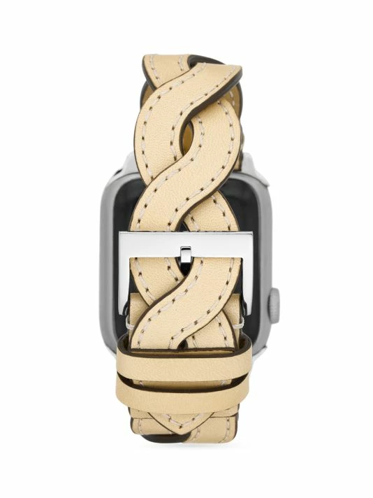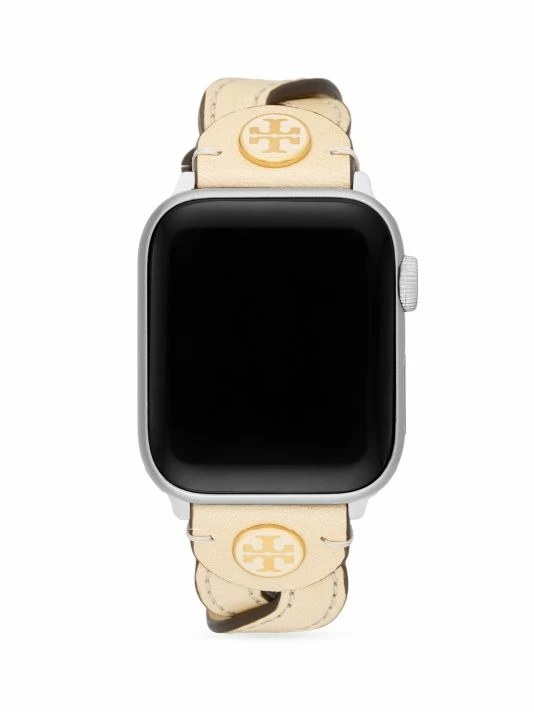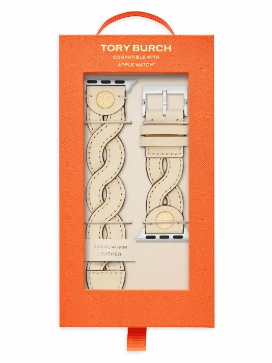 From the Braided Collection. Tory Burch’s Apple Watch® strap is crafted of braided ivory leather. Secured with a stainless steel pin-buckle closure, this chic accessory is detailed with the brand’s signature Double T logo.