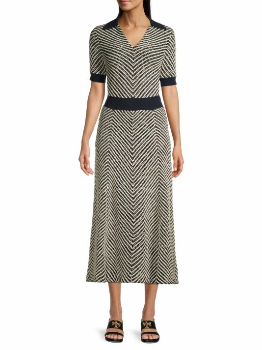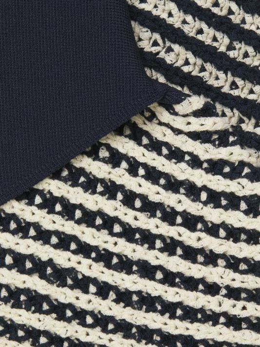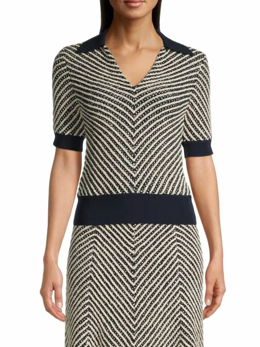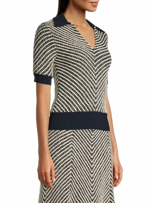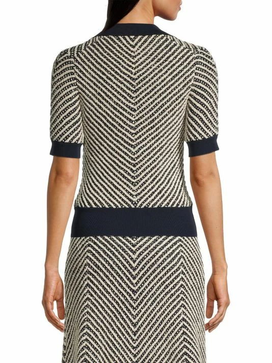 Crafted of a crochet cotton blend, Tory Burch’s short sleeve polo is designed in a chevron striped pattern.