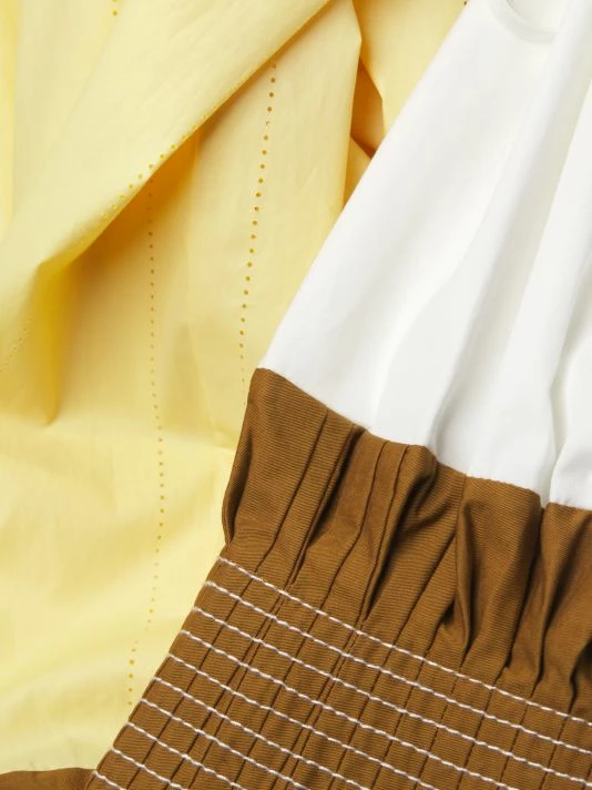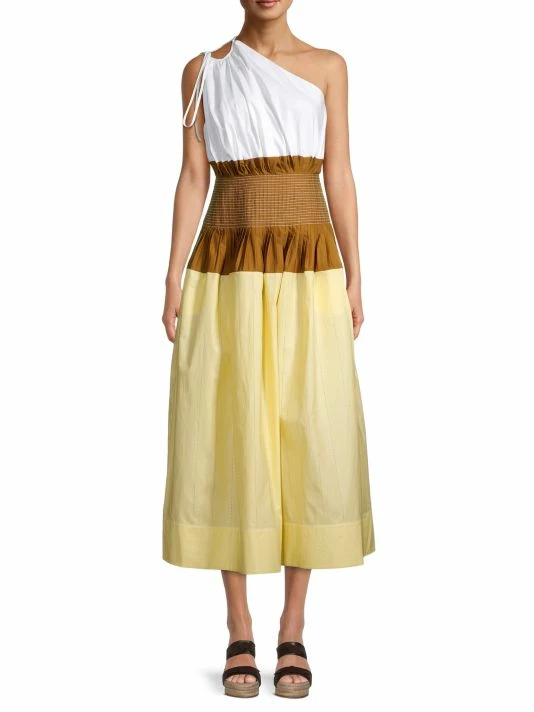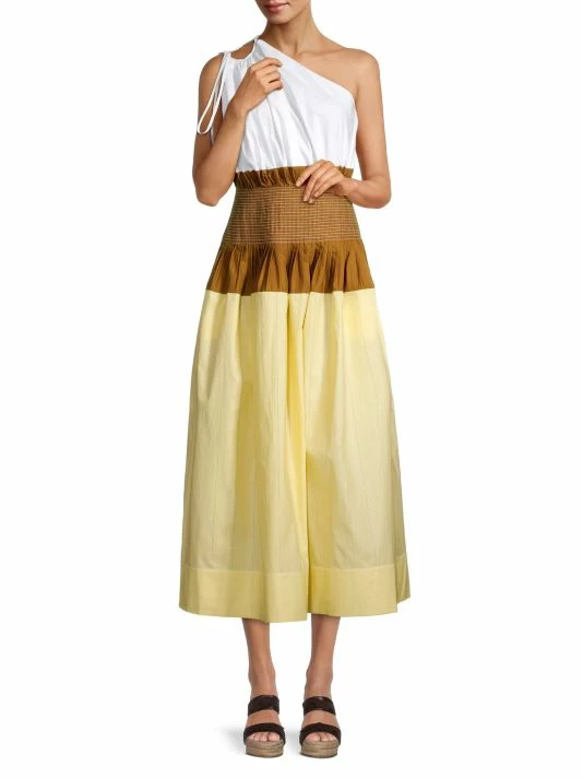 Colorblock styling lends dimension to this one-shoulder midi dress, crafted from crisp cotton poplin with smocking to define the waist.