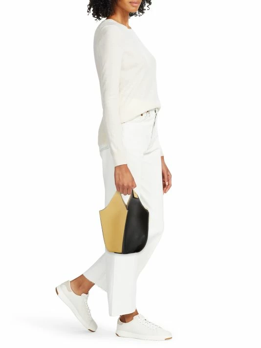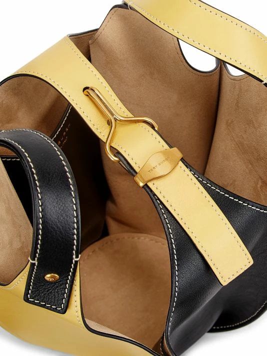 Tory Burch’s Lampshade bag is an upturned twist on the 1950s-style lampshade hat. This piece has a soft yet architectural construction, in smooth colorblocked leather with a clean-finished leather interior.