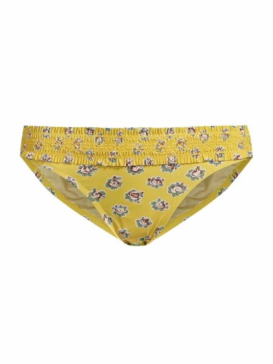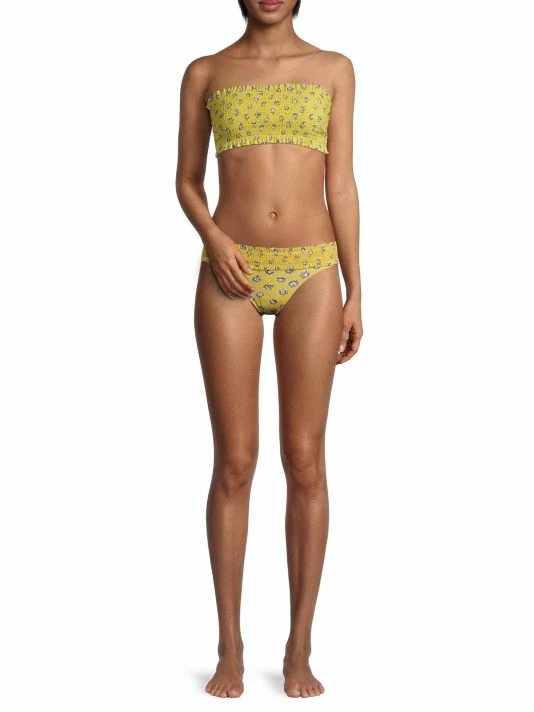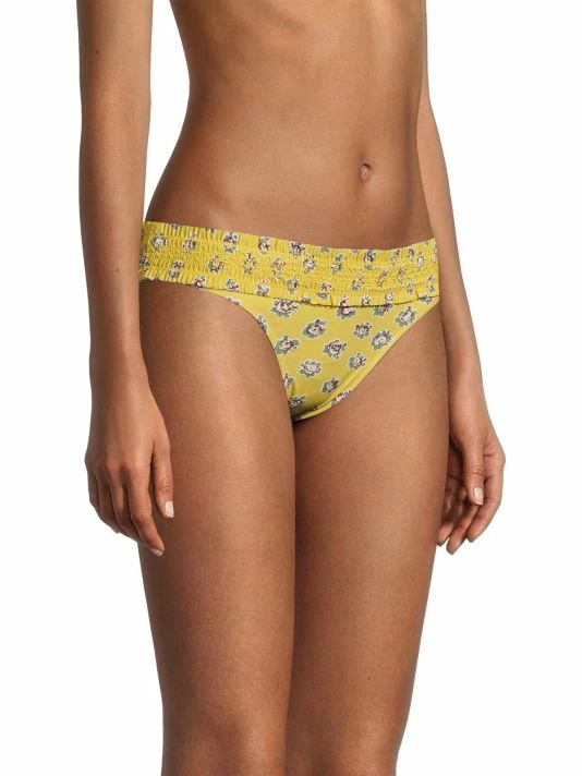 The Tory Burch Coasta hipster bikini bottom is adorned with a floral motif. It features a smocked waistband and sits low and straight across the hips.
