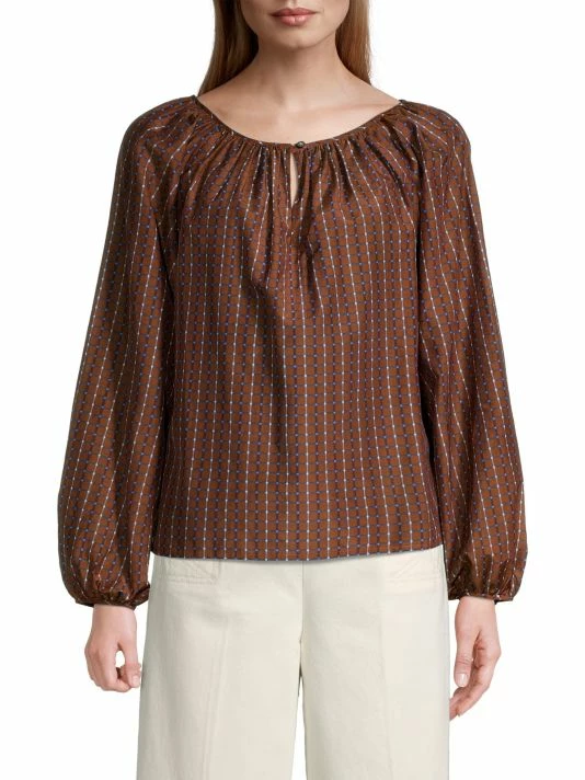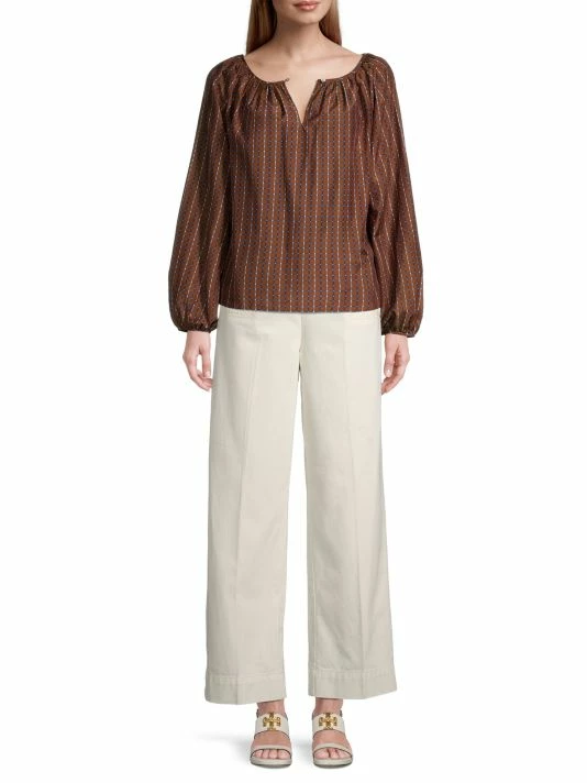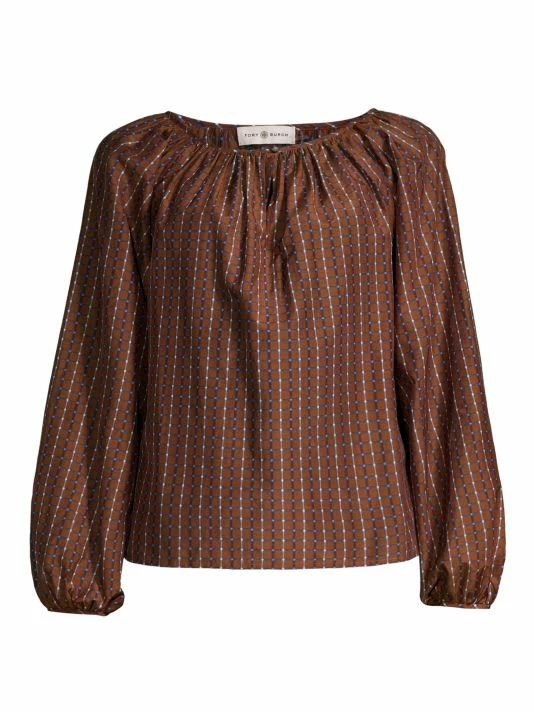 Flaunting voluminous balloon sleeves, Tory Burch’s relaxed-fit top is designed in a dotted windowpane print.