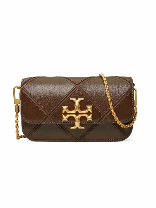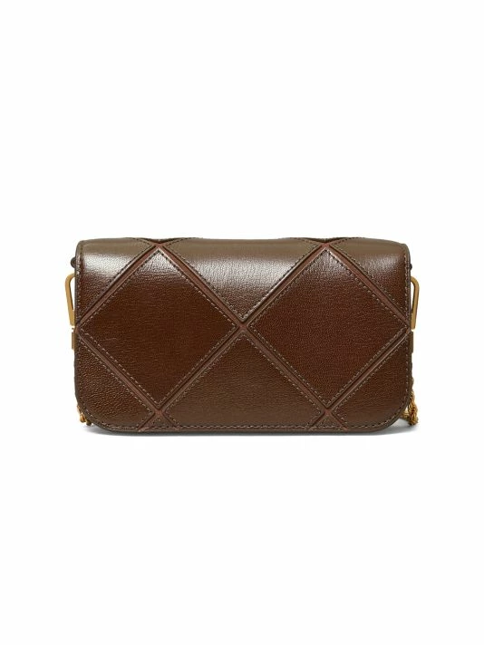 This quiltted crossbody bag features exposed stitching and a logo emblem on the front flap.