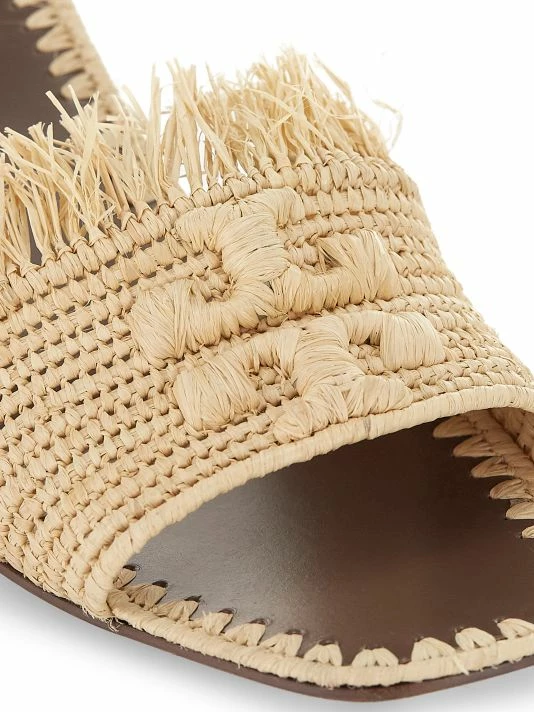 Anchored by a chic kitten heel, Tory Burch’s Eleanor mules are crafted of woven raffia adorned with a signature Double T logo. This slip-on pair is finished with wispy knotted fringes at the vamp strap.