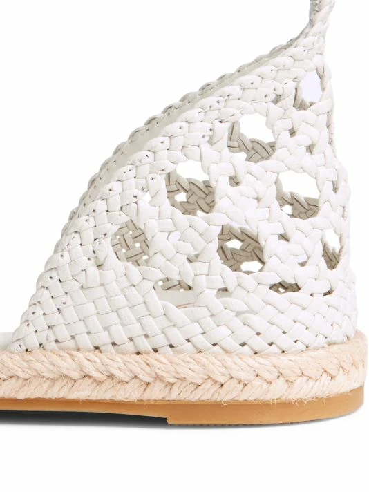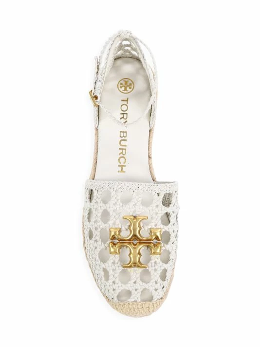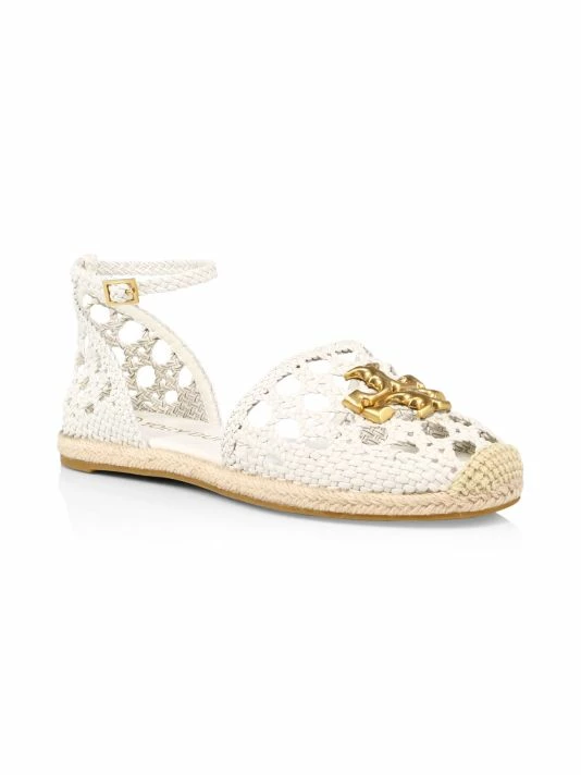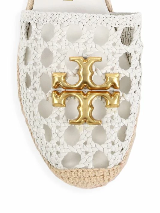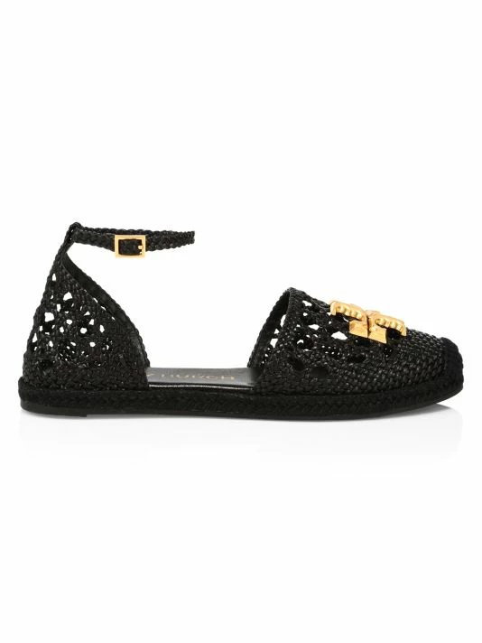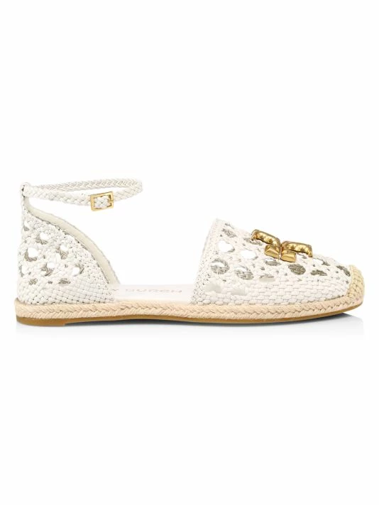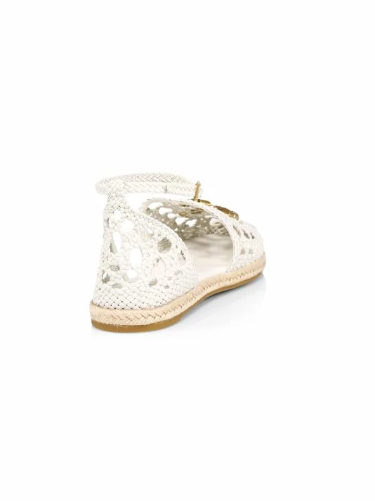 Set atop a beachy espadrille sole, these d’Orsay sandals feature an intricately woven leather upper topped with polished goldtone logo hardware.