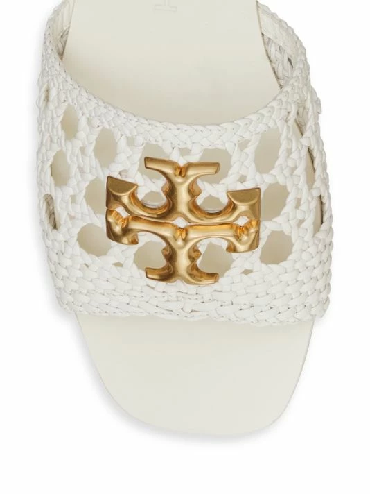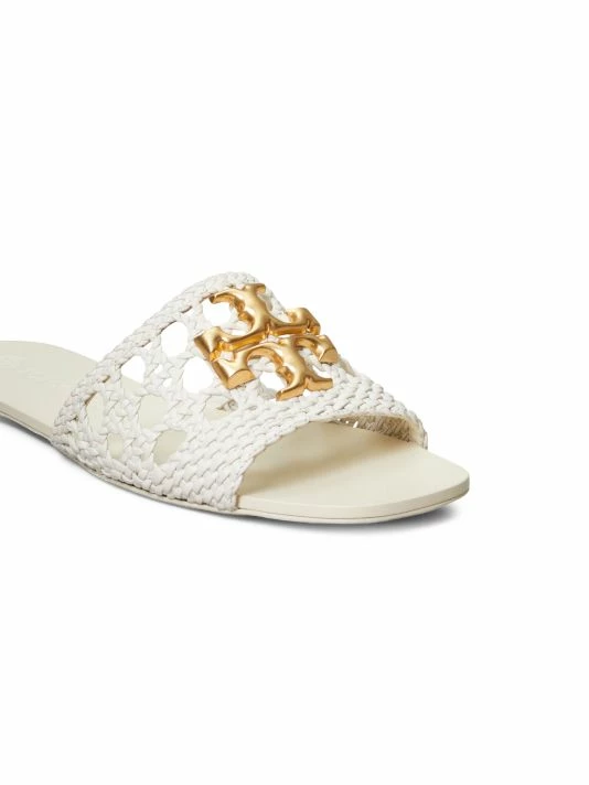 These simple flat sandals feature an intricately woven leather upper topped with polished goldtone logo hardware.
