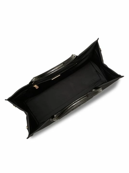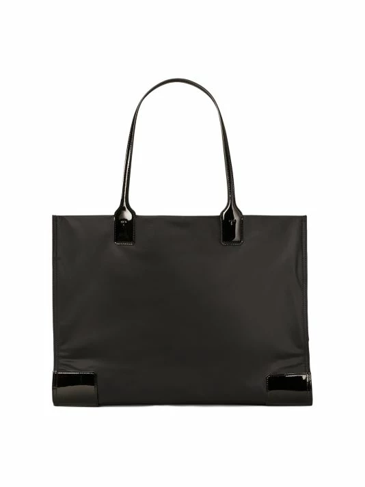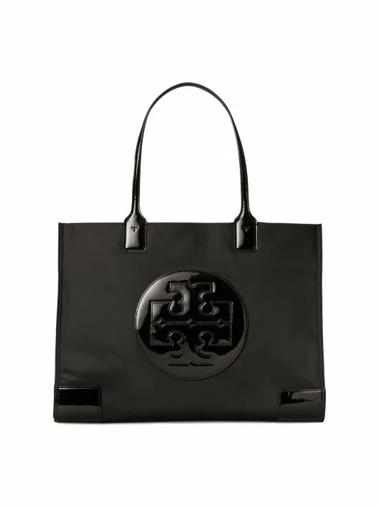 Utilitarian tote bag emblazoned with signature logo and highlighted with patent vegan leather trim.