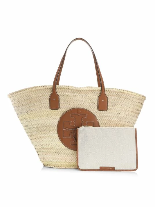 Trimmed with rich leather, this beachy straw tote has a roomy interior and removable zippered canvas pouch.