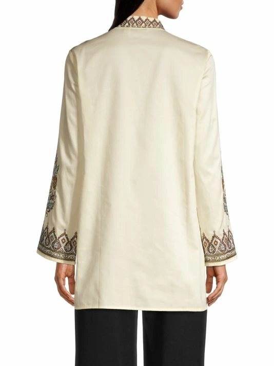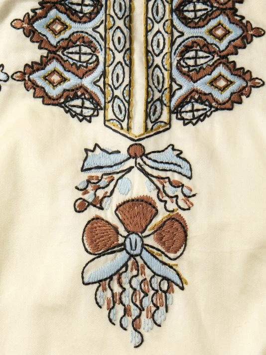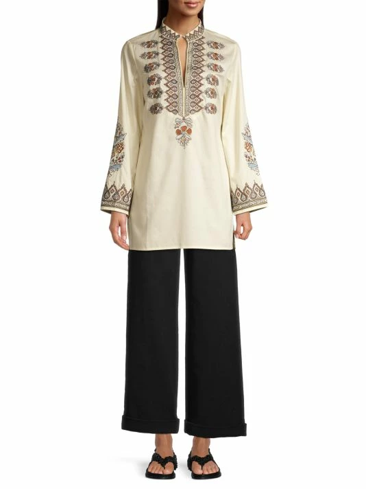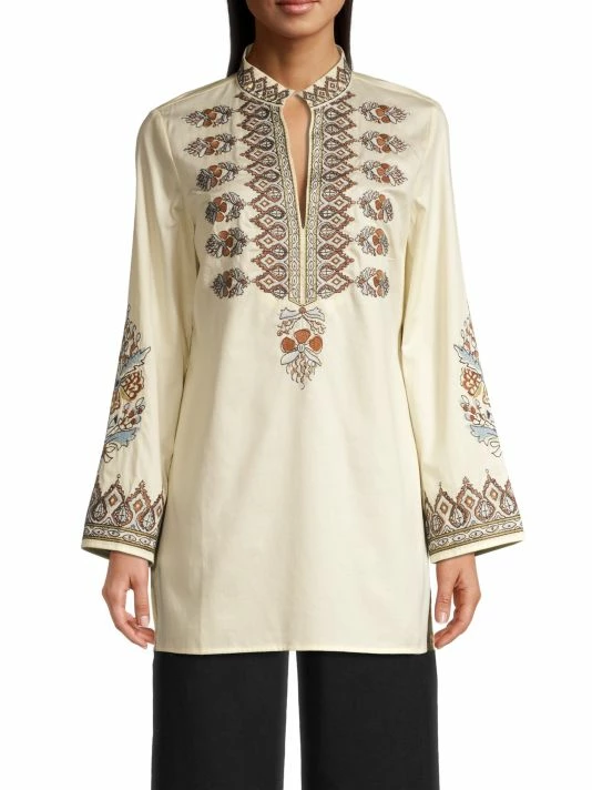 This lightweight cotton tunic is accented with intricate embroidery and a cutout at the neckline.
