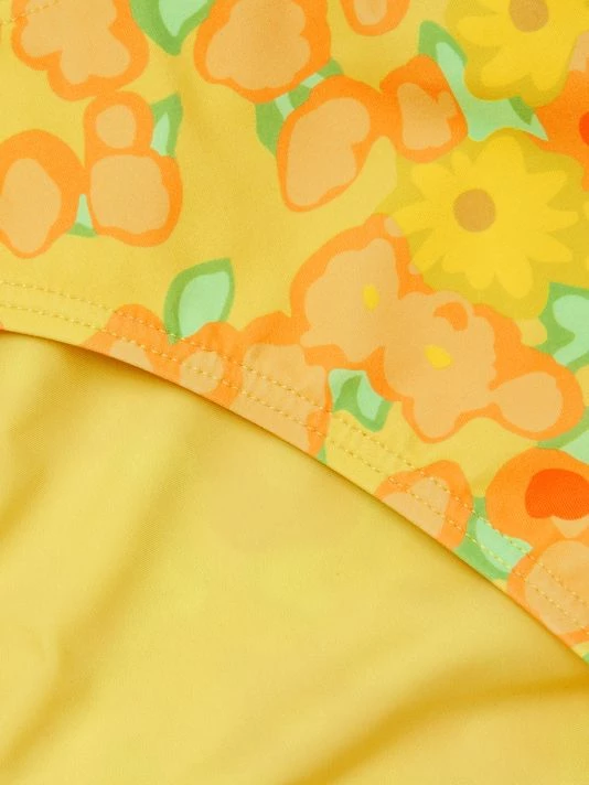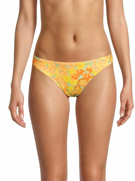 This hipster bikini bottom by Tory Burch is adorned with a floral motif. It sits low and straight across the hips.
