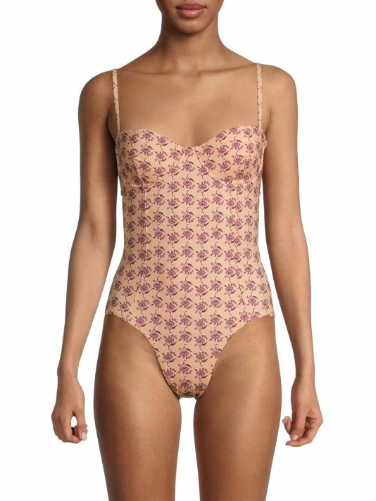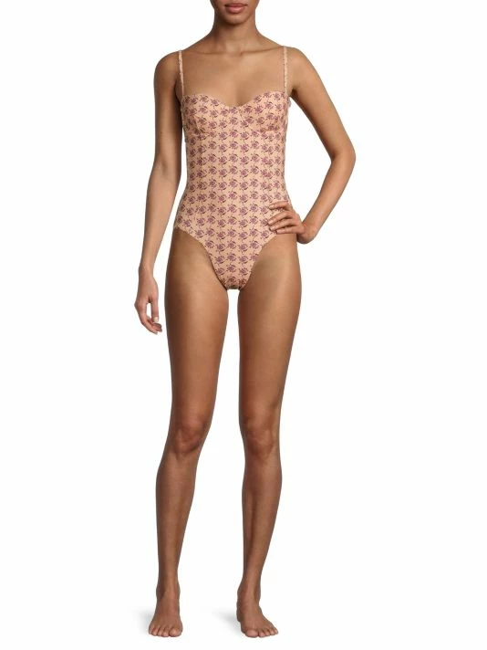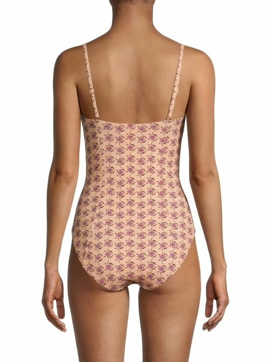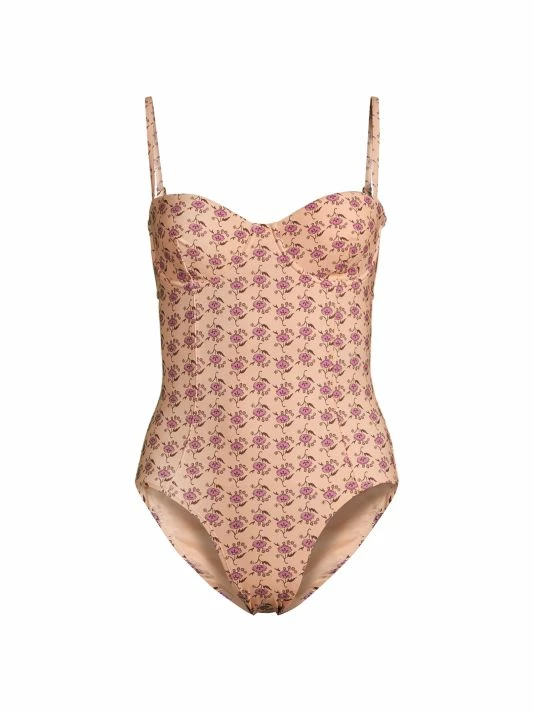 This one-piece swimsuit is complete with a structured sweetheart neck and playful floral print.