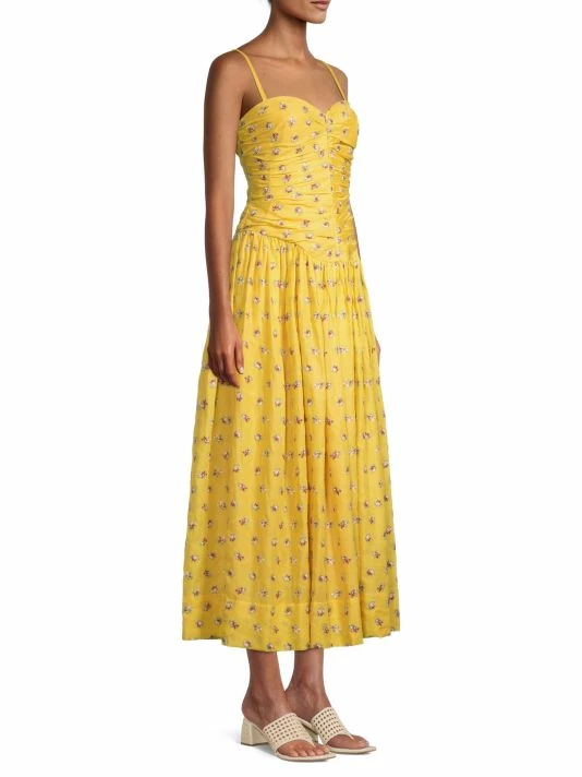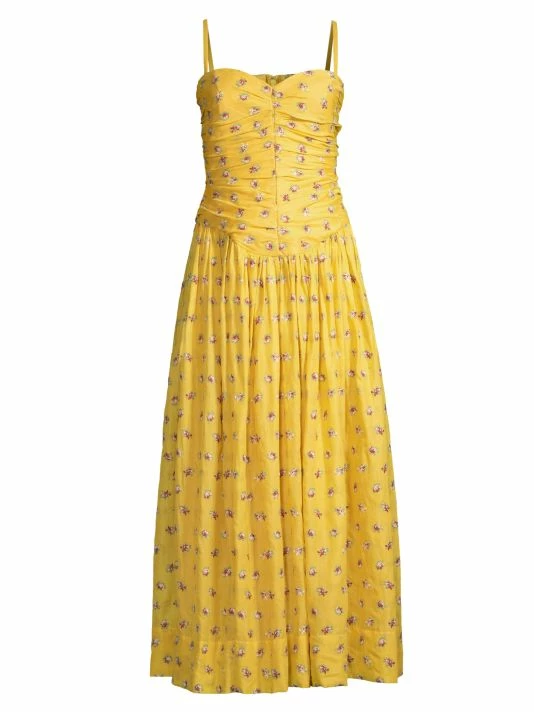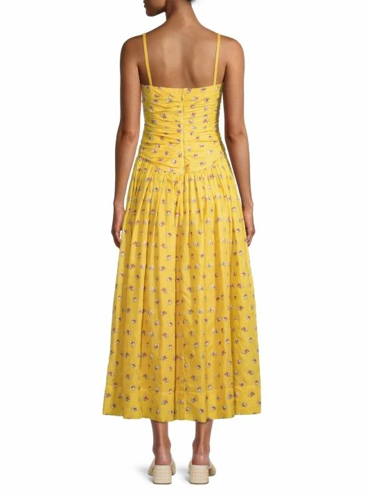 Tory Burch’s sleeveless midi-dress boasts a gathered bodice and floral garden rose print.