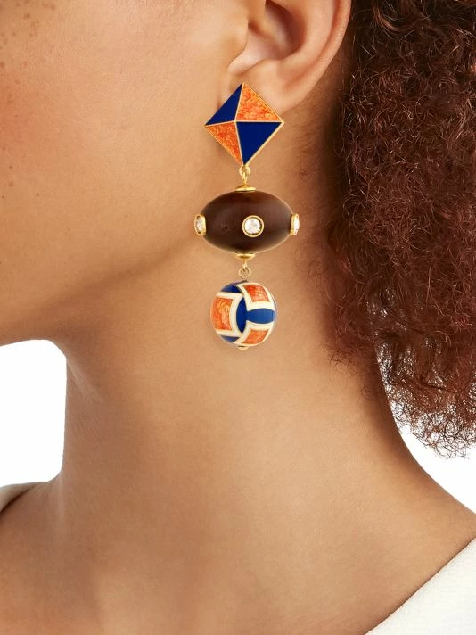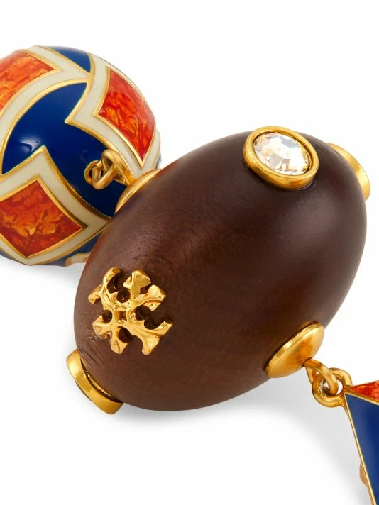 Tory Burch’s Geo earrings feature tiered wood and epoxy drops set in goldtone brass.