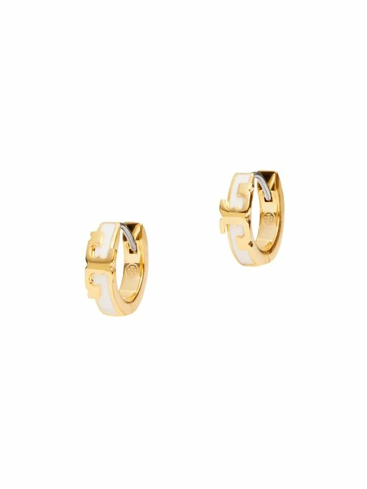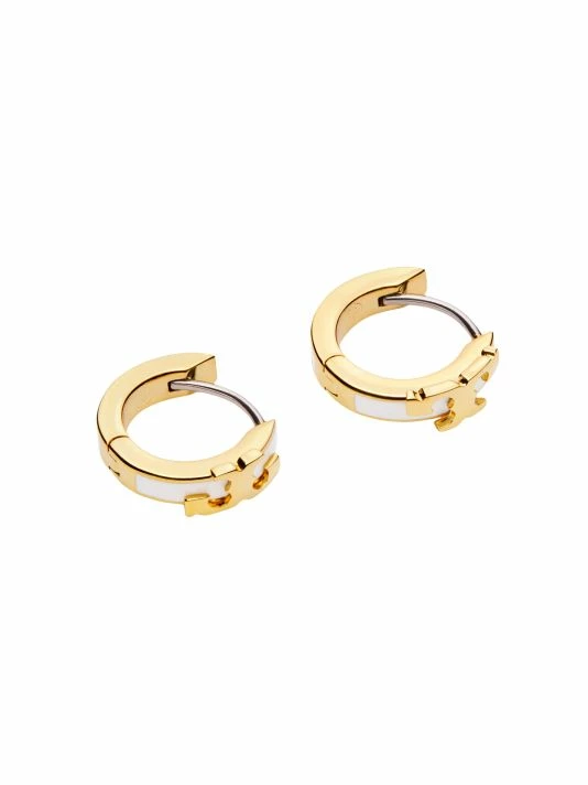 Shimmering golden hoops inlaid with enamel, bear the iconic serif T logo.