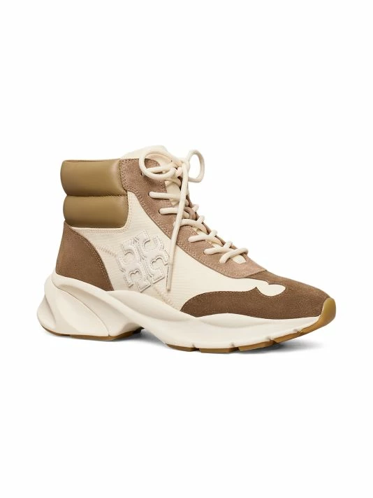 Leather and suede colorblocking shapes these sporty shoes, a modern hybrid between hiking boots and high-top sneakers.