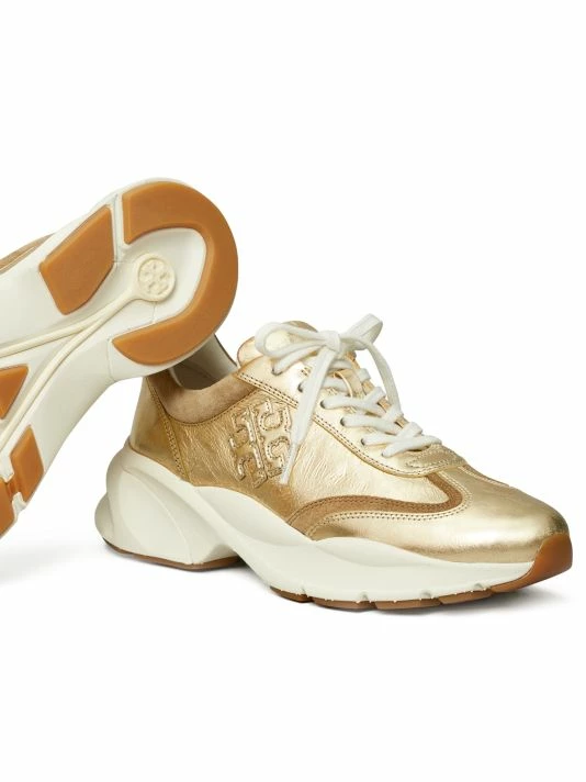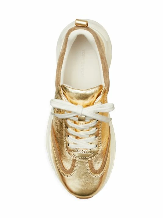 From the Good Luck Collection. Tory Burch’s trainers are crafted of gleaming metallic leather and rich suede with signature Double T logo patches at the sidewalls. This low-top pair is elevated with a chunky sport sole.