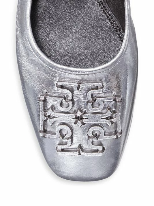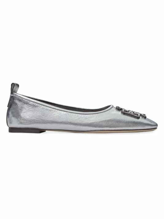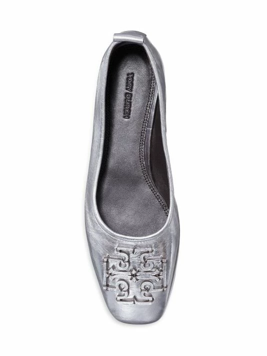 Enhanced with a modern square toe, Tory Burch’s Ines ballet flats are crafted of gleaming metallic leather with stitched Double T logo appliqués.