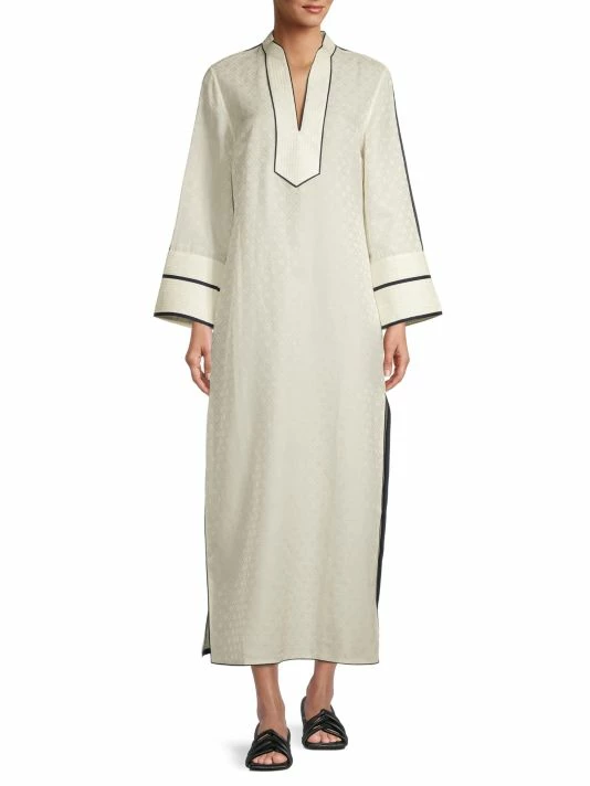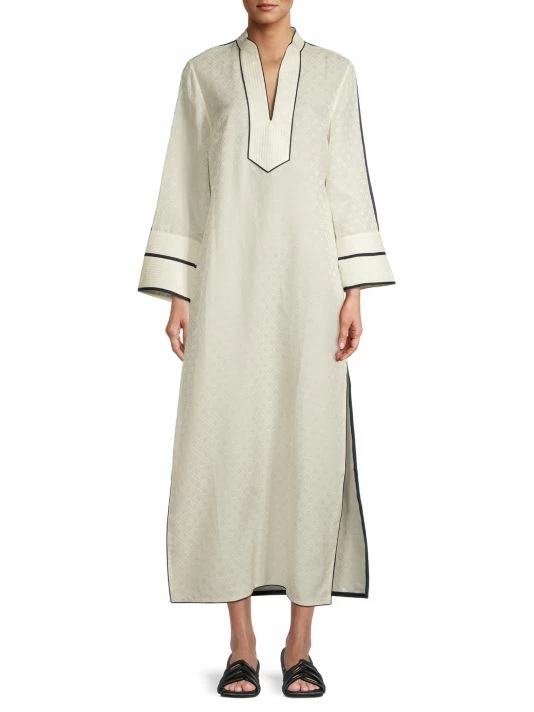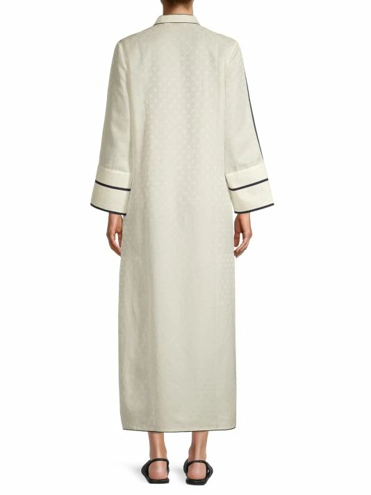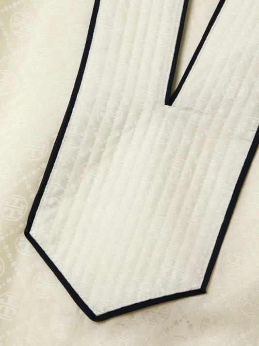 The Jacquard Trapunto Tunic by Tory Bruch is adorned with a signature T monogram jacquard print. It is adorned with Trapunto stitch detailing at the placket, collar, and cuffs.