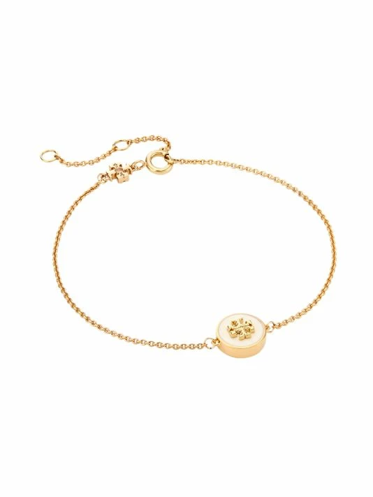 Tory Burch’s 18K-gold-plated Kira bracelet features a round charm showcasing the designer’s iconic Double T logo. Inlaid with ivory enamel, this chic embellishment is fixed to a fine cable chain that secures with a spring-ring clasp.