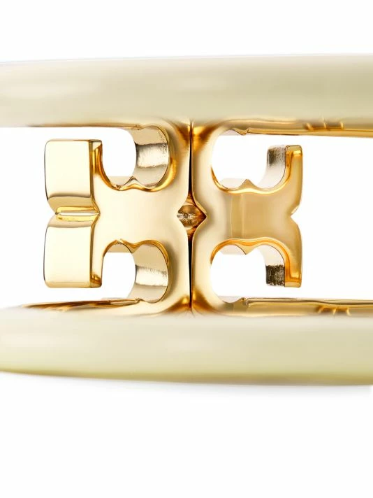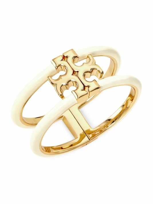 Crafted of 18K-gold-plated metal and ivory enamel, Tory Burch’s wide bangle showcases the label’s iconic Double T logo. This trendy accessory adds a modern, glamorous touch to the wrist.
