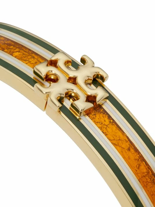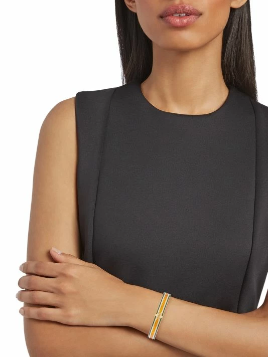 From the Kira Collection. Tory Burch’s 18K-gold-plated Kira bangle makes a bold statement with its striped enamel and foil details. Completed with a polished finish, this eye-catching accessory is detailed with the designer’s iconic Double T logo.