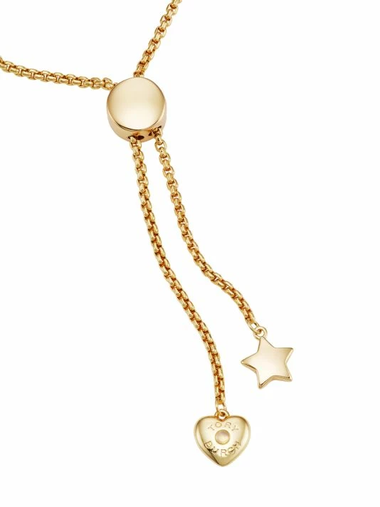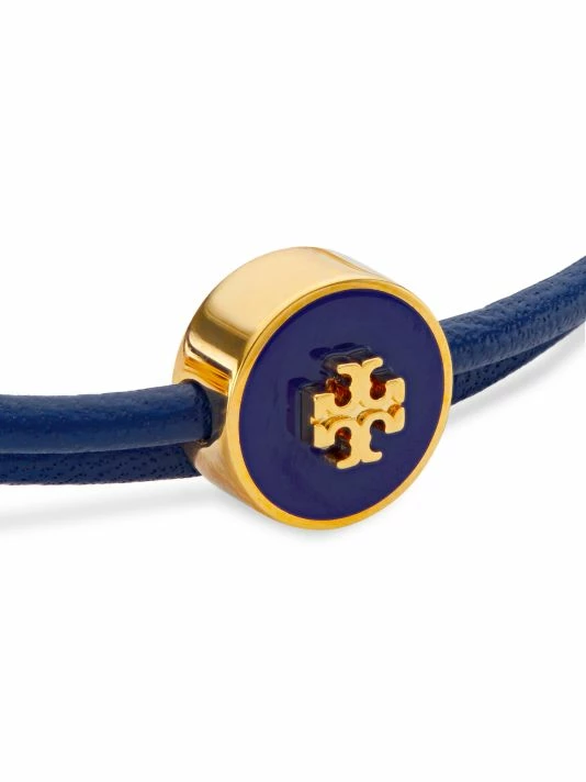 Adorned with two 18K-gold-plated and enamel logo charms, Tory Burch’s Kira bracelet features two leather cords joined to a box chain tipped with a star and heart charm.