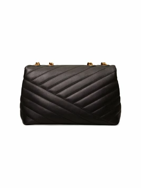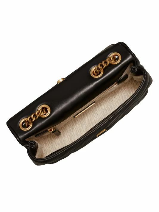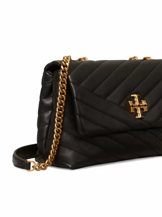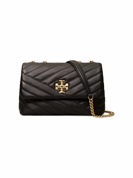 Tory Burch’s Kira shoulder bag is made of soft chevron-quilted leather with beveled Double T hardware. An adjustable chain strap adapts in the moment — doubled over the shoulder, or long and crossbody.