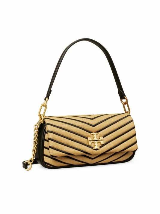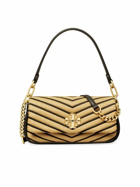 Tory Burch’s Kira flap shoulder bag is crafted of straw with graphic stitching, creating a quilted chevron effect. This piece boasts a removable chain-link shoulder strap with beveled Double T logo hardware.