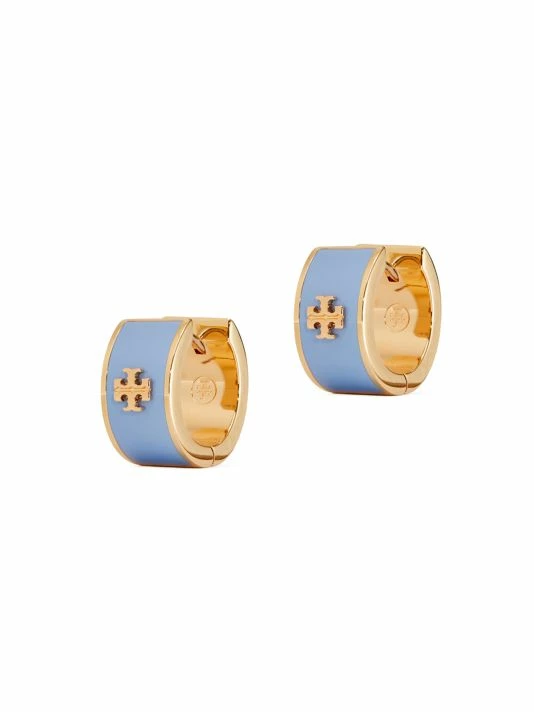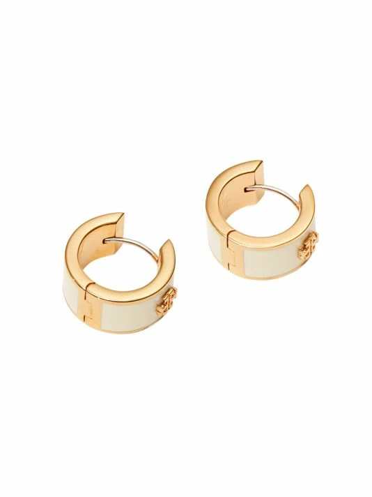 Polished enamel hinged huggie earrings with raised double-T goldtone logo.