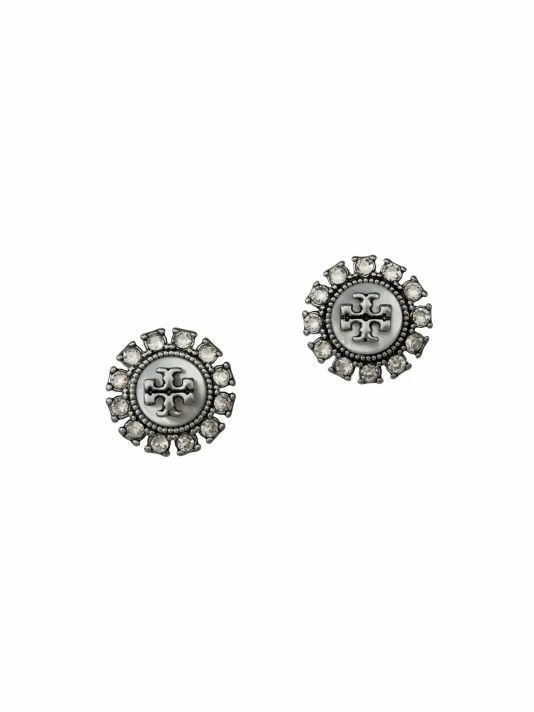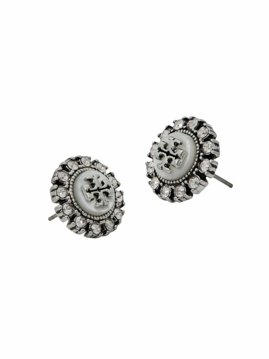 Embossed with the brand’s signature double T logo, these elegant silvertone metal and mother-of-pearl stud earrings sparkle with a border of round white crystals.