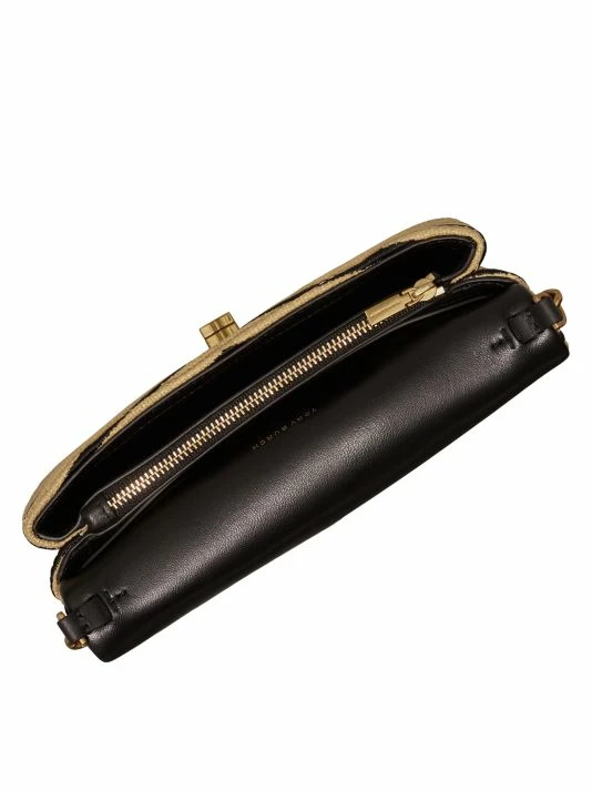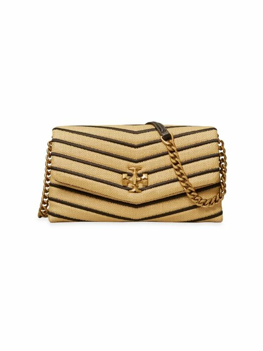 Tory Burch’s Kira wallet is crafted of straw with graphic stitching, creating a quilted chevron effect. This bag is designed with a chain shoulder strap with a Double T logo beveled turn-lock closure.