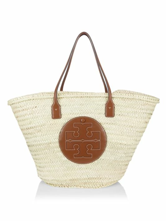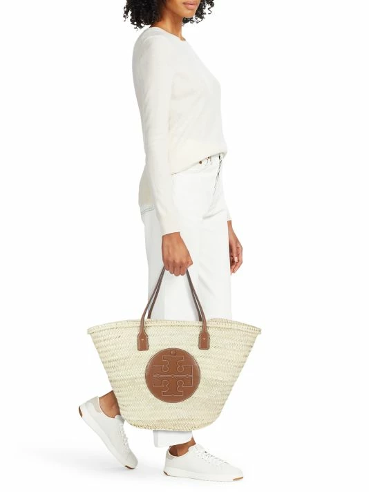 Detailed with an oversized Double T logo patch, Tory Burch’s Ella tote is crafted of woven straw with rich leather straps.
