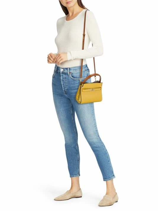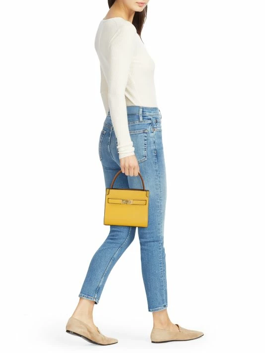 Composed of layers that unfold like the collar of a trench coat, Tory Burch’s Lee Radziwill bag can be worn open, semi-buttoned, or fully closed. This piece is beautifully crafted in leather and suede with signature lock-and-key hardware.