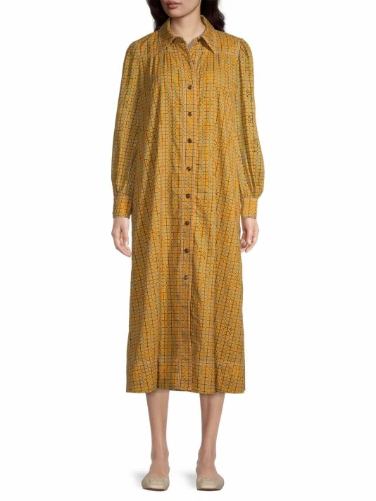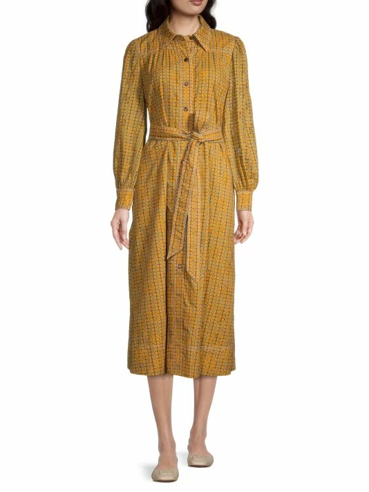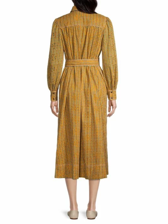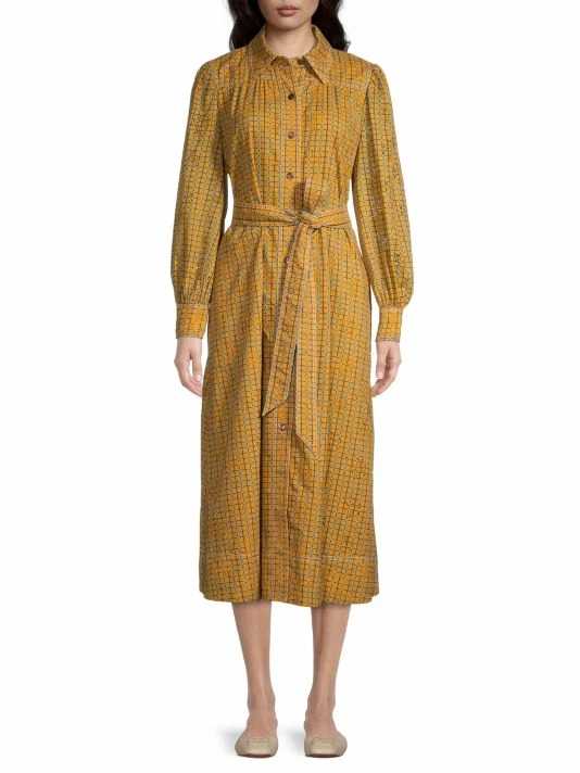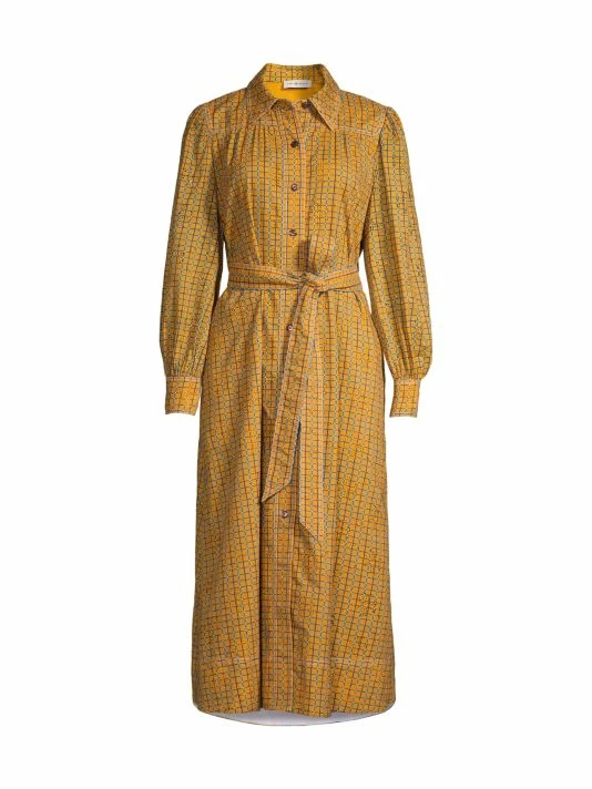 Cut from checked cotton, Tory Burch’s midi-dress is designed with broderie anglaise logos, a button-front closure, and a self-tie belt at the waist.