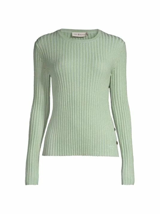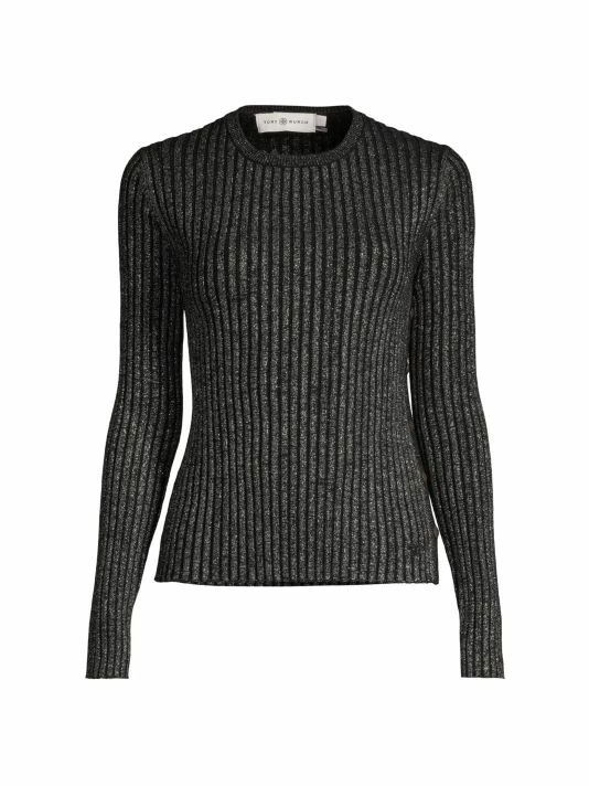 Metallic stripes cover this ultra-soft fitted sweater, featuring allover ribbing for shape.