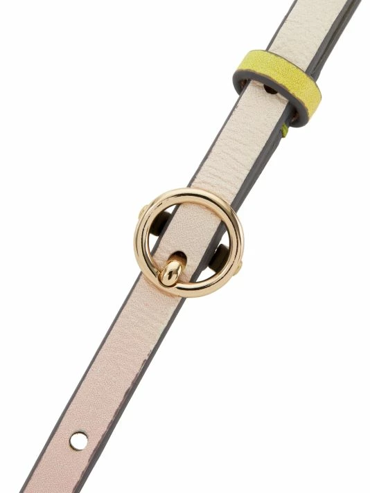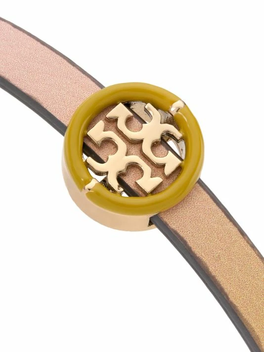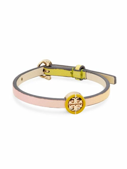 Composed of light pink leather, Tory Burch’s Miller bracelet features a polished 18K-gold-plated and enamel charm showcasing the designer’s signature Double T logo.