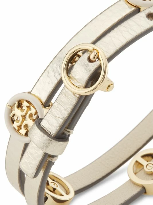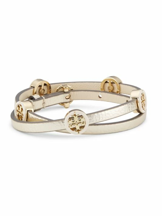 Composed of yellow leather, Tory Burch’s Miller double-wrap bracelet is accented with polished 18K-gold-plated and enamel charms showcasing the designer’s signature Double T logo.