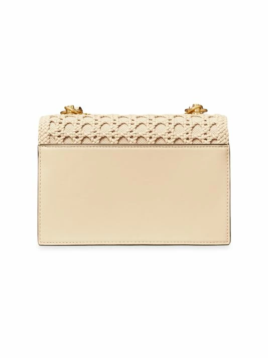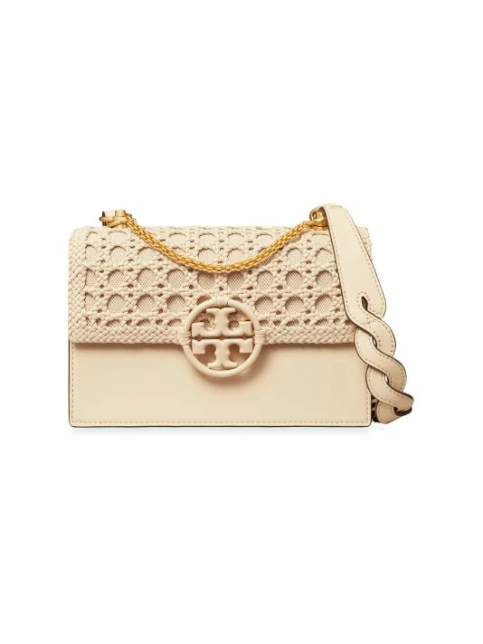 Tory Burch’s Miller shoulder bag is designed with an adjustable hand-braided strap and a removable gold chain. A striking expression of workmanship and artistry, this piece is crafted of leather woven in an intricate basket-weave layered over canvas, with artisanal stitching, and signature Double T hardware.
