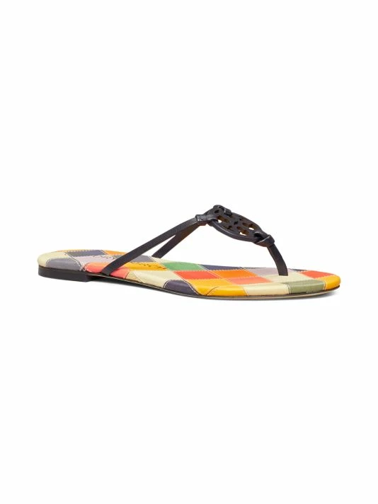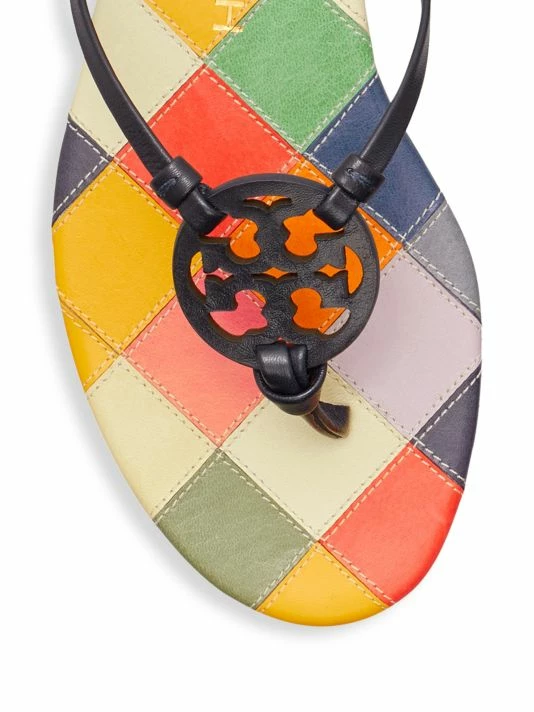 A colorful patchwork pattern highlights the footbed of these thong sandals featuring a signature Double T medallion.