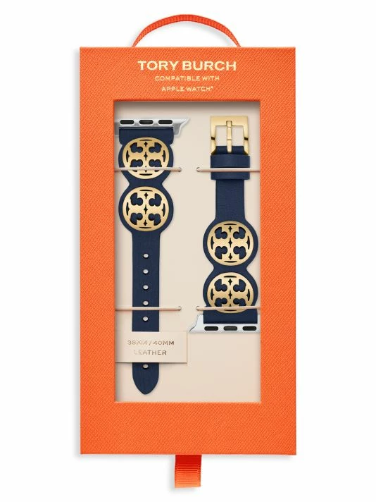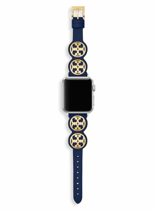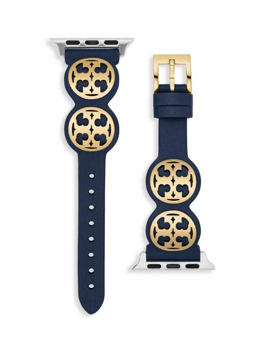 From the Apple® Strap Collection. This leather and stainless steel band is flanked with Logo medallions at each side and fits the Apple® Watch one, two, three, four five and six series.