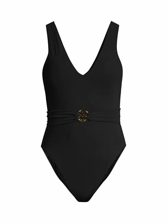 A sleek logo belt completes the signature look of this sultry one-piece swimsuit.