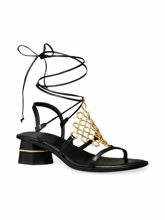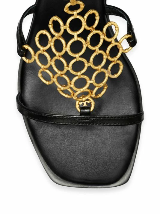 Tory Burch’s Multi-Logo sandals feature a series of enamel hoops, linked together in a diamond formation and embellished with a Double T charm.