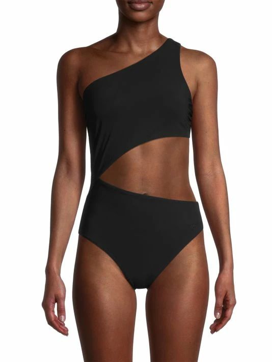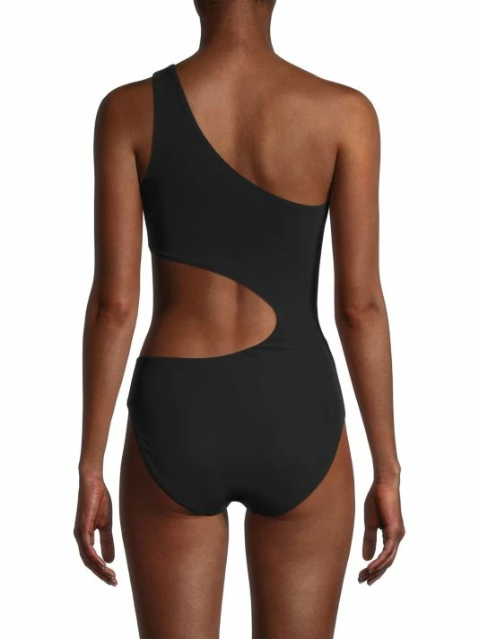 This one-piece swimsuit features an asymmetric neckline and cutout waist detail.