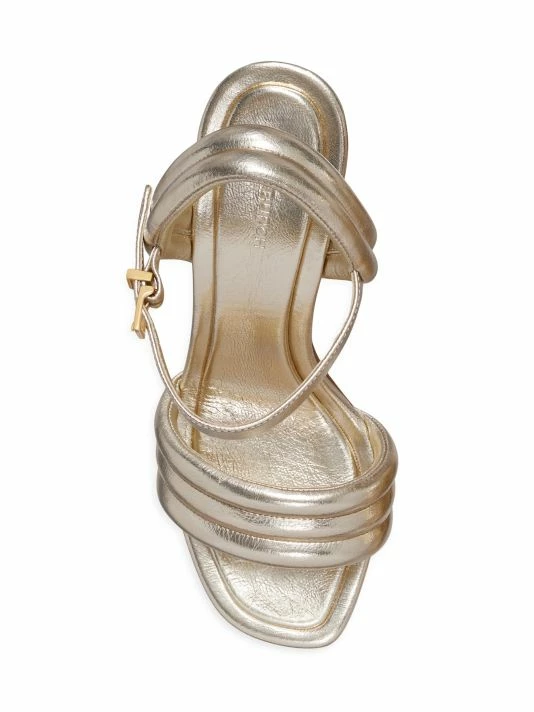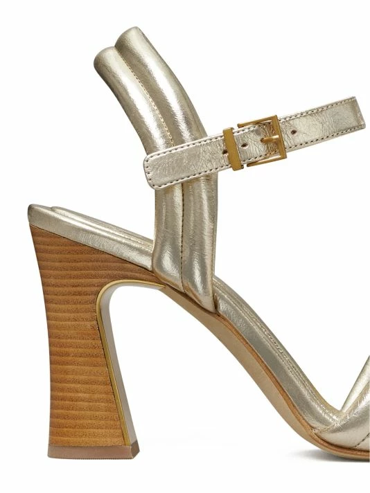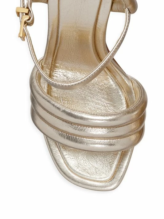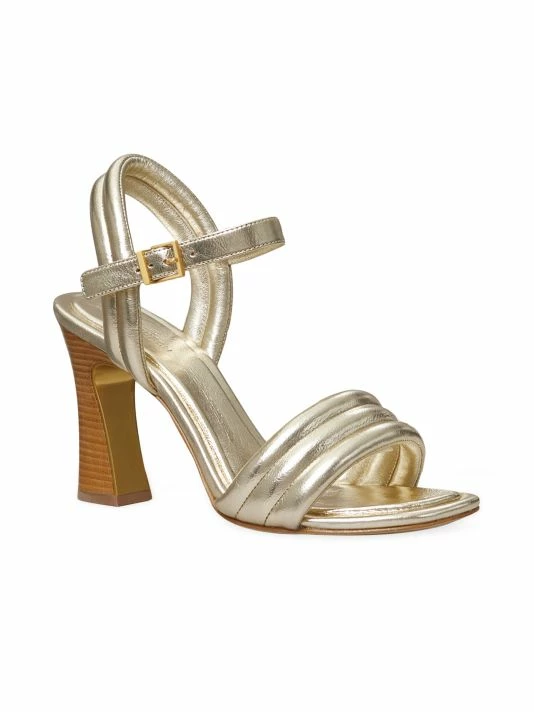 Anchored by a stacked block heel, Tory Burch’s Puffed Up sandals are crafted of padded metallic leather with quilted over stitching.