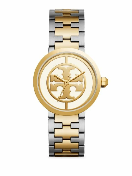 From the Reva Collection. Goldtone signature double T logo showcases this chic and stylish two-tone stainless steel timepiece.