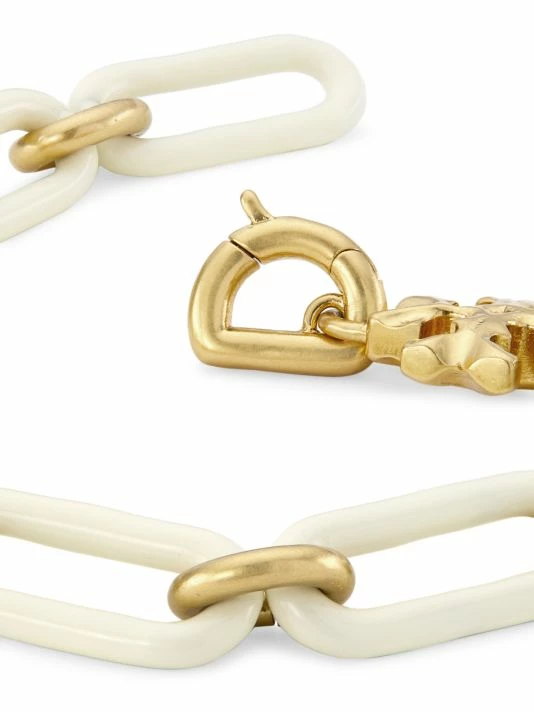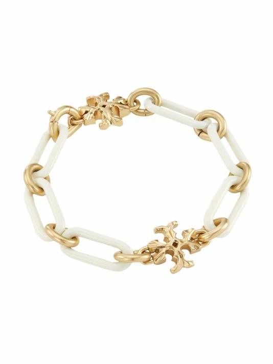 Crafted of 18K-gold-plated metal and black enamel, Tory Burch’s Roxanne chain bracelet is embellished with two links sculpted in the shape of the designer’s signature Double T logo. This bold accessory adds a chic, modern touch to the wrist.
