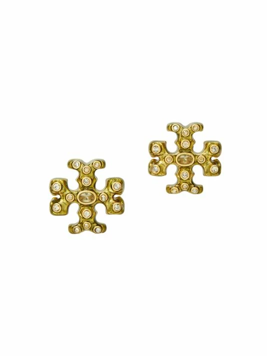 Sculpted in the shape of the label’s signature Double-T logo, Tory Burch’s stud earrings are crafted of goldtone metal and enamel embellished with sparkling crystals.