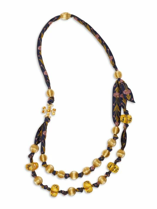 A piece that adds vibrant color and texture to any look, this necklace is composed of woven jacquard knotted with beads of fluted goldtone metal and resin. This chic accessory may be looped once or twice for versatile styling.